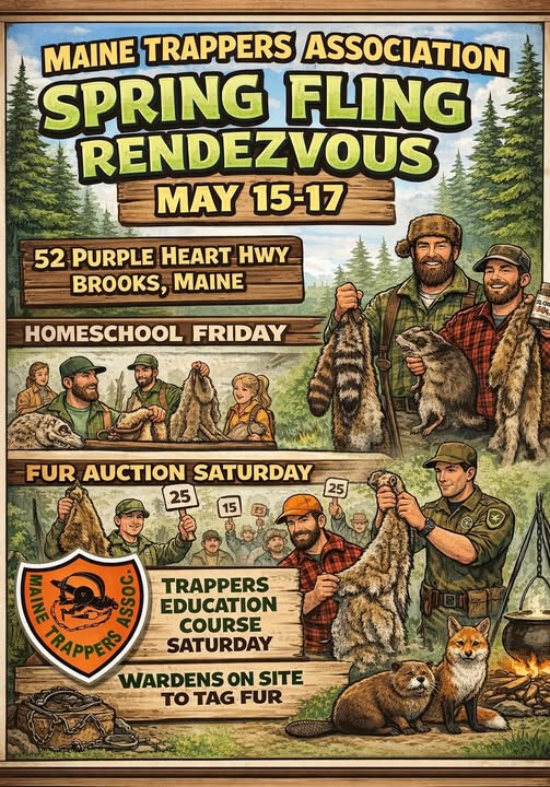 - April 26, 2026 Central Maine Chapter Spring Fur Auction 768 Main St, Palmyra, Maine. doors open 7am for a 8am start. Fur Tagging and 3% commission FMI contact Ted Perkins 207-570-6243